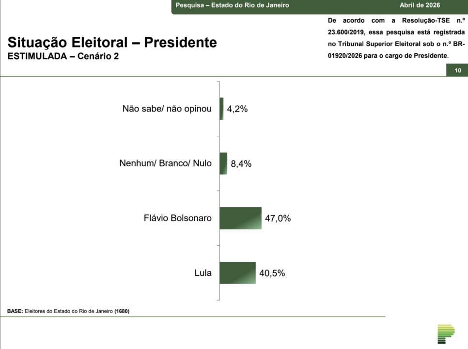 A pesquisa foi realizada entre 21 e 23 de abril, com 1.680 eleitores em 63 municípios do estado. O levantamento tem margem de erro de 2,4 pontos percentuais e nível de confiança de 95%.
